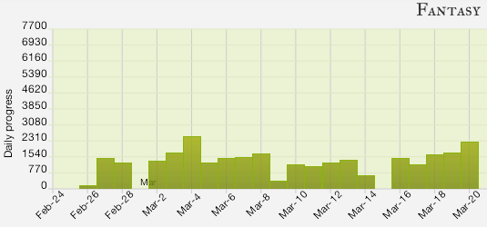 You will have good writing days and bad writing days. As you can see from the chart above, sometimes, I could barely write a thing. You know what kept me going and contributed to my writing day streak (the program I use says I stuck to my plan for 13 days! That's almost two weeks~)? I had a nice bar counting how many words I'd put in. I had something to show me that even though it felt like I was not moving forward, I really was.