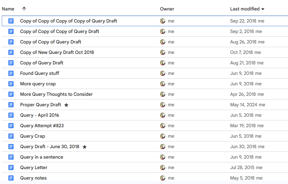 I spent May researching agents again and cracking out the query letter, which is basically like a personalized cover letter to the agent you’re seeking representation from. This has always been a very difficult part for me, as you can see from my eight billion previous attempts: